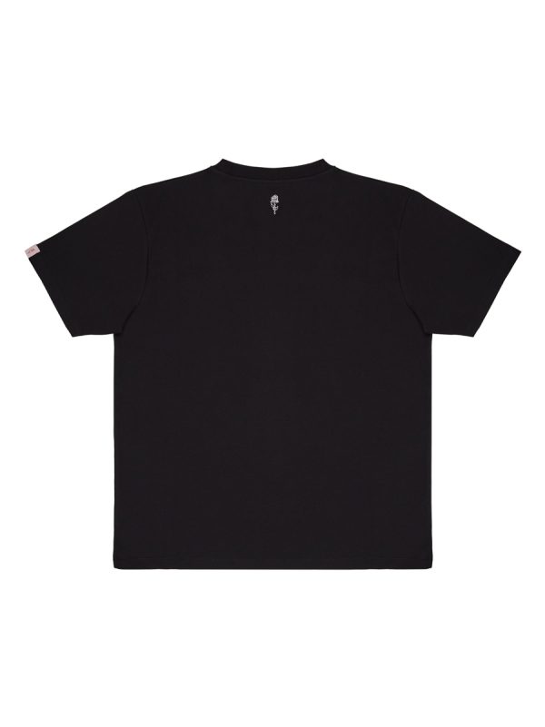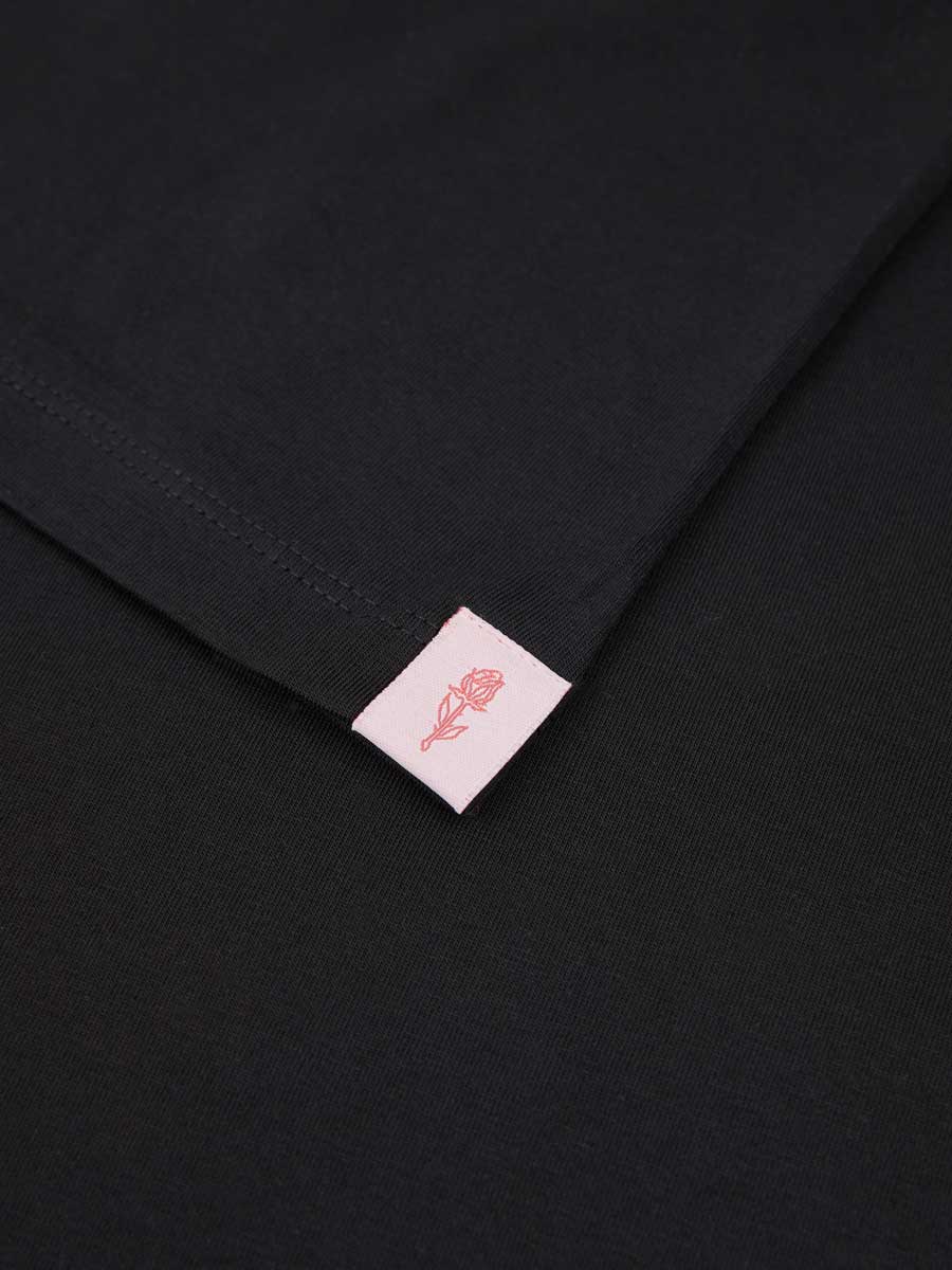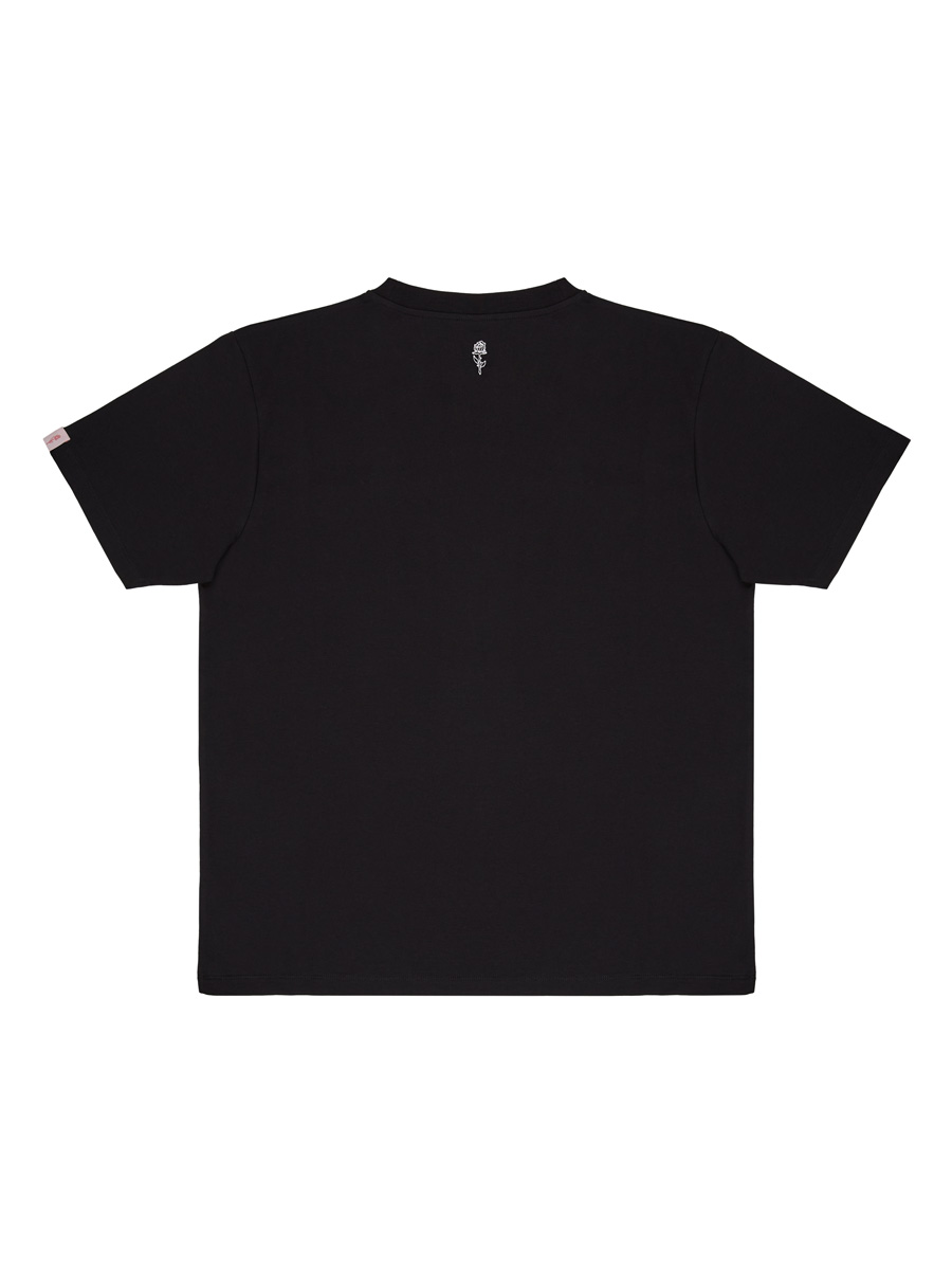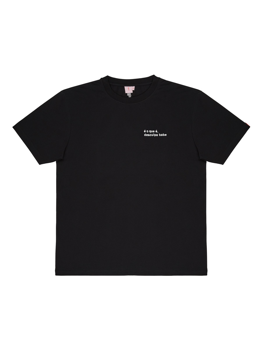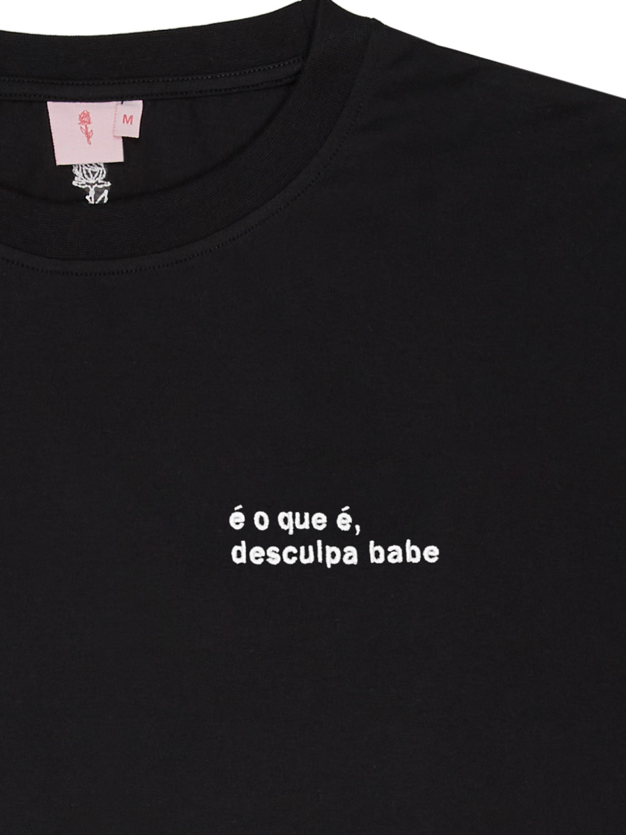 Preto clássico, corte unissexo e bordado com aquele ar de quem já viu de tudo. É o que é.